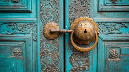 Intricate Traditional Chinese Lion Door Knocker on Teal Ancient Door with Decorative Ornaments AI Generative
