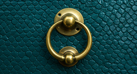 Old brass door knocker on a turquoise leather background.