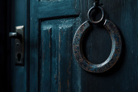A weathered metal ring is suspended from a rustic wooden door, creating a blend of charm and history in a softly lit space during the evening.