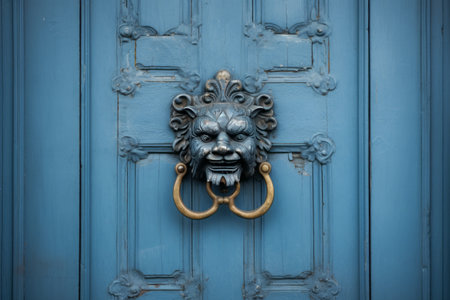 lion head door knocker made from brass on a blue painted door