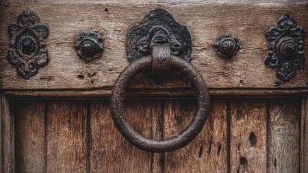 A captivating view of an antique wooden door featuring a rustic metal knocker and intricate decorative elements. Ideal for architectural and design inspiration.