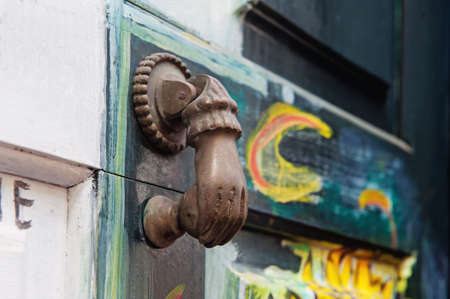 An ornate, weathered door knocker hangs from an old wooden door, showing intricate details and a rich history through its tarnished surface and vibrant textures.