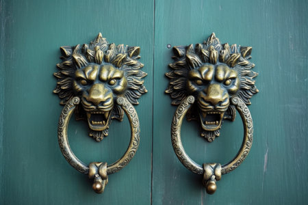 Discover the intricate details of a vintage wooden door featuring ornate lion knockers and a vibrant, weathered paint finish, evoking a sense of history.