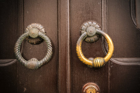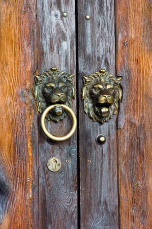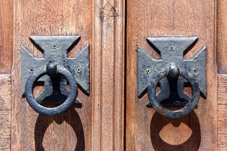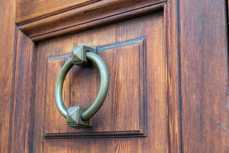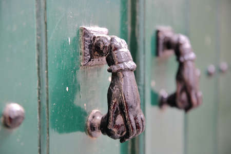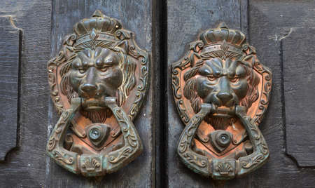 door knocker and handle on the front door of an old building in Old Town Budva in Montenegro, Europe, Adriatic Sea and mountains,