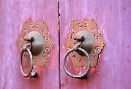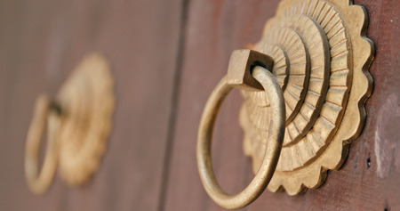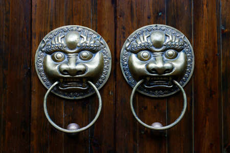 Old metal knocker with lion head in the traditional Chinese style on the temple door.