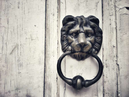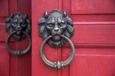 door handle in the form of a lion's head with a ring in its mouth on a metal door.