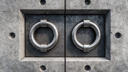 Close-up view of two metal ring handles fixed to a textured concrete wall, showcasing industrial design elements in a modern urban setting.