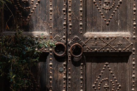 Close-up view of a rustic wooden door featuring antique hardware. This vintage entryway captures the charm of traditional architecture and craftsmanship.
