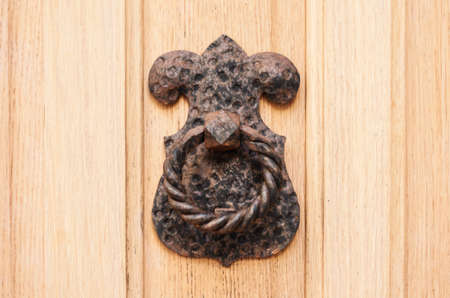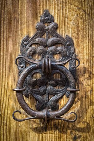 Close up on a historic door knocker on an old wooden door. Typical is the beautiful ornament and the manufacture of iron.