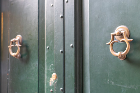 Elegant brass knockers adorn weathered green doors in a charming historic building, evoking a sense of timeless elegance and mystery