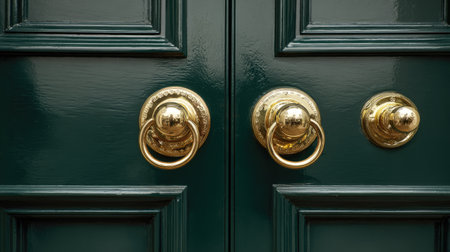 A close-up view of an elegant green door featuring luxurious golden knobs and rings, exemplifying exquisite craftsmanship and timeless architectural style.