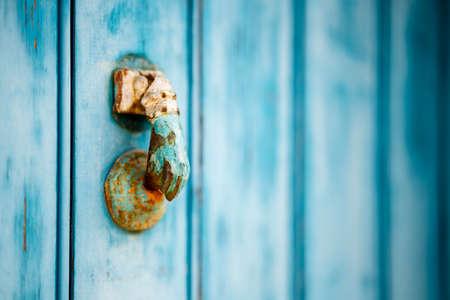 Weathered knocker on blue wooden door in Olhao, Algarve, Portugal