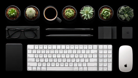 An overhead shot presents a minimalist workspace arrangement. It features a keyboard, mouse, pens, glasses, and small potted succulents set against a dark backdrop. The composition is clean, with neutral tones. This image is suitable for design, technology, or lifestyle content.