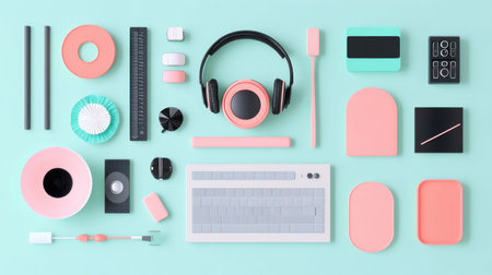 A flat lay showcasing a variety of pink and blue objects on a blue background, including cameras, headphones, keyboards, and other items.