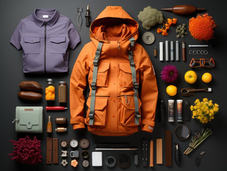 A variety of items ld out on a table. Outdoor and adventure clothing brand, various items, knolling, top view, flat lay overhead.