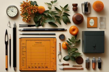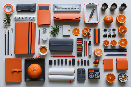 A flat lay of neatly arranged orange-themed office supplies paired with fresh oranges and greenery on a clean white background. this vibrant and organized display aims to inspire creativity, productivity, and a refreshing work environment. Generative AI