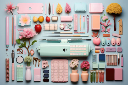 Vibrant assortment of stationery and playful supplies on mint green backdrop, highlighting creativity and organization in a cheerful workspace environment