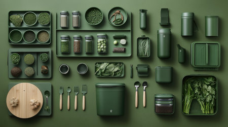 Explore a vibrant arrangement of green kitchenware designed for food storage and preparation, featuring various containers, utensils, and fresh produce, ideal for a healthy lifestyle.
