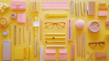 A vibrant flatlay of colorful stationery and office supplies arranged neatly on a yellow background, perfect for creative workspace inspiration and organization themes.