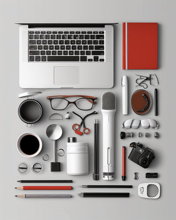 flat lay of colorful marketing materials and gadgets, created with generative ai