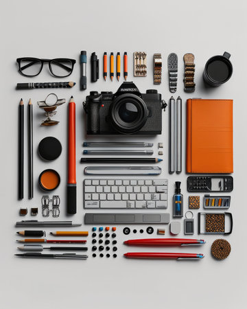 Top view of a creative workspace with various items including a camera, notepad, and craft materials, creating an artistic and organized scene.