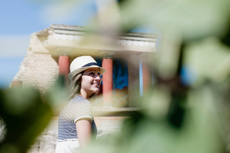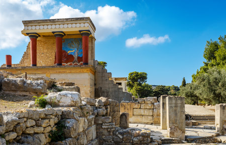 Greece, Crete, Heraklion - July 18, 2018: Knossos ruins, ceremonial and political centre of the tsar Minos. Archaeological site connected with legends of Daedalus, Minotaur, Ariadne and Icarus