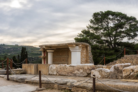 Palace of Knossos, Crete, Greece. The site was a major center of the Minoan civilization and is known for its association with the Greek myth of Theseus and the minotaur.
