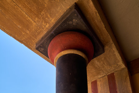 The striking red and black column of Knossos Palace stands against the backdrop of weathered stone ruins, showcasing the distinctive architectural style of the Minoan civilization under the Mediterranean sunlight.