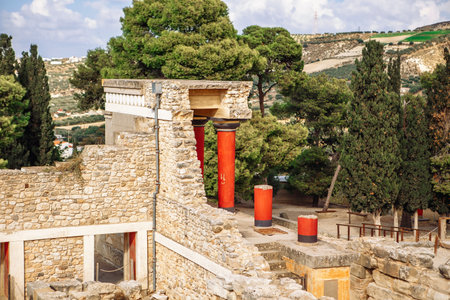Knossos, Greece - November 2, 2017: Knossos palace, Crete island, Greece. Detail of ancient ruins of famous Minoan palace of Knossos. It is the largest Bronze Age archaeological site on Crete.