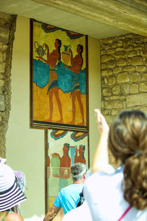 Crete, Greece - September 11, 2017: Blurred tourists in front of a Greek paintings of Cup Bearer Fresco in the ruins of palace of Knossos. Most famous historical place in the capital of Minoan Crete.