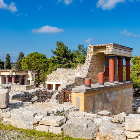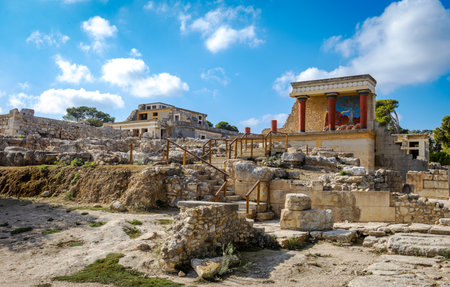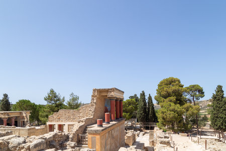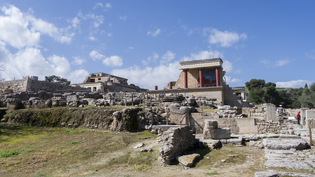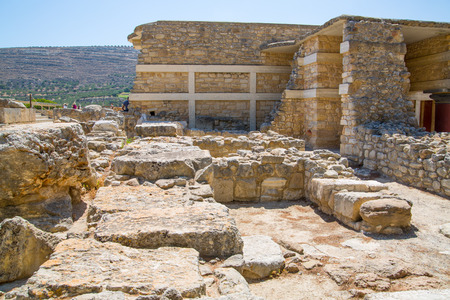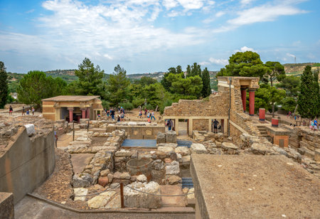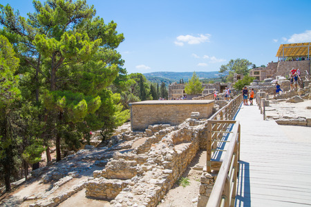 Knossos, Crete, June 10, 2017: Scenic ruins of the Minoan Palace of Knossos. Knossos palace is the largest Bronze Age archaeological site on Crete of the Minoan civilization and culture