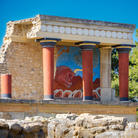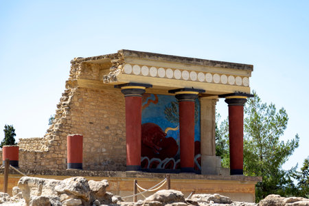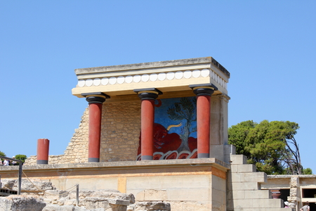 CRETE, GREECE - JULY 26, 2015: Knossos Palace is the largest Bronze Age archaeological site on Crete. Restored North Entrance with charging bull fresco