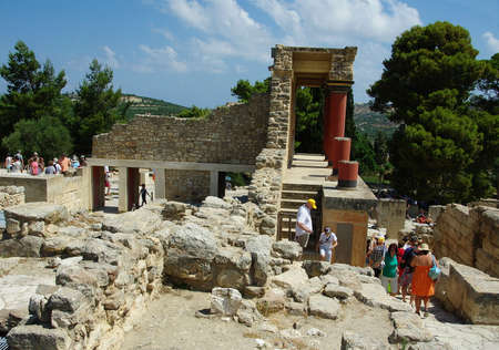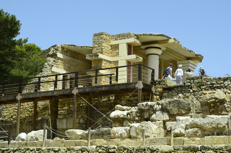 Knossos, Greece - May 26th 2014: Unidentified tourists by sightseeing of the ancient Minoan palace in Crete, a tourist attraction and archeological site of bronce age
