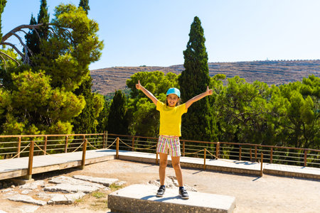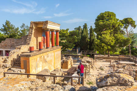 Greece, Crete, Heraklion - July 18, 2018: Knossos ruins, ceremonial and political centre of the tsar Minos. Archaeological site connected with legends of Daedalus, Minotaur, Ariadne and Icarus