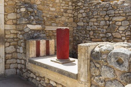 Knossos. Ruins of the ancient Minoan palace, stone walls and red columns. Crete, Greece.