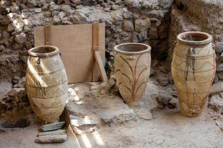 Santorini, Greece - September 18, 2020: Recovered ancient pottery in prehistoric town of Akrotiri, one of the most important prehistoric settlements of the Aegean. An archaeological site of Akrotiri in Santorini, Greece