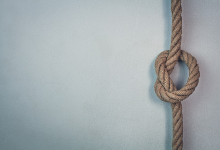 Close look at a tightly tied knot made of natural rope with soft sunlight in background