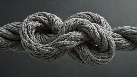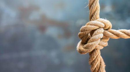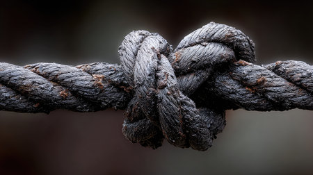 A close-up view of a thick, weathered rope tied in a complex and secure knot. This image represents concepts of strength, connection, and overcoming difficult challenges through unity and resilience.