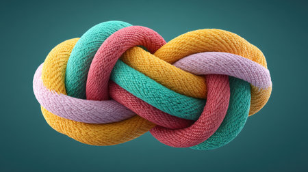 Intertwined ropes of diverse colors symbolize unity and synergy in teamwork, forming a strong, cohesive bond.