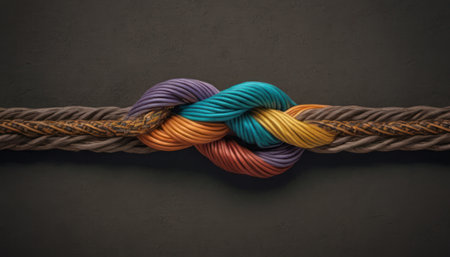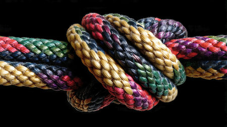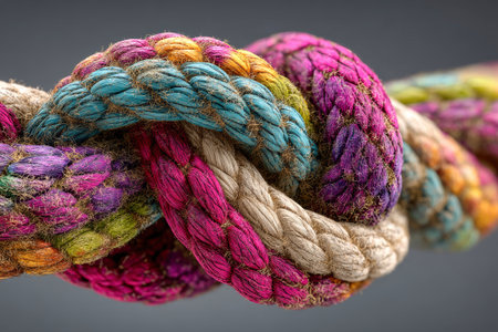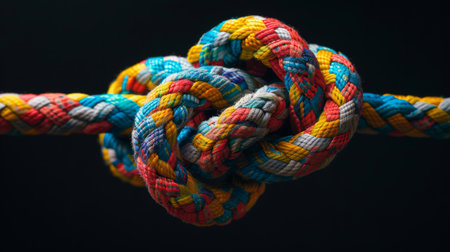 Close-up view of vibrant multi-colored ropes tied in a detailed knot, showing texture and the concept of connection and resilience in a striking manner.