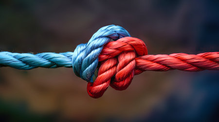 A close-up image of a red and blue rope intertwined in a knot, suggesting unity and strength through connection.