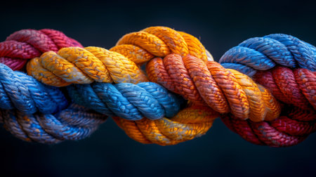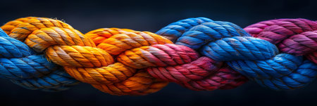 Intertwined ropes of diverse colors symbolize unity and synergy in teamwork, forming a strong, cohesive bond.