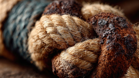 A close-up of the texture and details on an old, heavy rope with three strands. The thick, brown color creates a contrast against the background, emphasizing its ruggedness. The ropes appear to be coiled together in shallow waves or a patterned shape, suggesting their use as part of a harbor system. This photo highlights not just the beauty but also some history behind it. --chaos 30 --ar 16:9 --stylize 750 --v 7 Job ID: 6bb0108f-f0c4-45a9-b55e-d5f14ea6f510