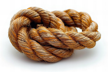 A close-up of an old, heavy rope with natural colors and texture. The ropes are intertwined in the center of the frame, creating an intricate pattern. There is no background, just very light tones to emphasize the details of each wrapped tip. This scene could represent ship mast lines or another outdoor setting where thick, twisted rope would have its place. --chaos 30 --ar 16:9 --stylize 750 --v 7 Job ID: 57fcdea0-04aa-4f50-b30f-555e87ba019e