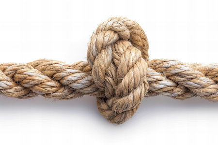 Close-up view of a tightly secured brown rope knot against a clean, neutral backdrop. This image showcases the intricate details and textures of the rope fibers, ideal for various creative and practical projects.