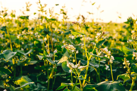 Farm field of flowering buckwheat with white flowers in sunset light. sunflare. agricultural plants cultivation. farming concept. Organic eco friendly food growing. Harvest landscape. Agro business.
