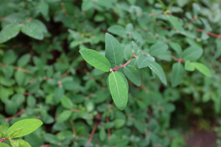 beautiful green branch of a honeysuckle bush on a blurred background. plant close-up. summer garden in the rays of the setting sun, magic light.