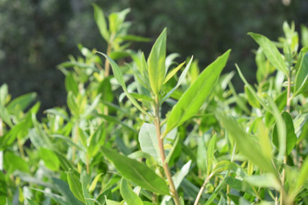 Close up of green leaves on blurred background, selective focus and shallow depth of field.