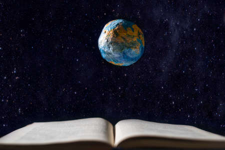 an open book, a levitating model of the planet earth levitates above it, against the background of outer space with stars. The concept of global knowledge, global knowledge system. Knowledge is the cosmos. A creative concept illustrating the power of knowledge from books transmitted around the world via the Internet, hovering in space like planet Earth.