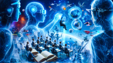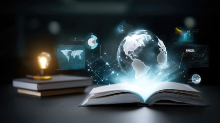 An open book emits light, surrounded by digital elements like a globe and graphs, symbolizing the fusion of knowledge and technology in modern learning.